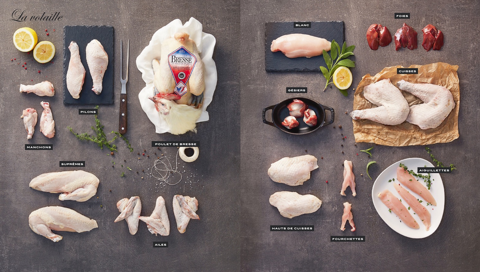 viandes, herbes, légumes, fruits,